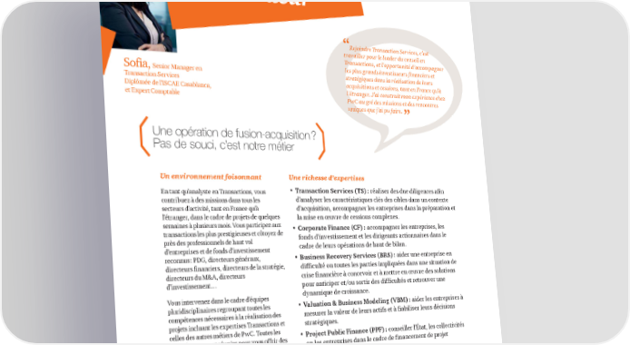 Transactions Fusaccordeur “Rejoindre Transaction Services, c’est travailler pour le leader du conseil en Transactions, et l'opportunité d'accompagner Sofia, Senior Manager en les plus grands investisseurs financiers et stratégiques dans la réalisation de leurs Transaction Services acquisitions et cessions, tant en France qu'à Diplômée de l'ISCAE Casablanca, l'étranger. J’ai construit mon expérience chez et Expert Comptable PwC au gré des missions et des rencontres uniques que j’ai pu faire. ” Une opération de fusion-acquisition ? Pas de souci, c’est notre métier Un environnement foisonnant Une richesse d’expertises En tant qu’analyste en Transactions, vous • Transaction Services (TS) : réaliser des due diligences afin contribuez à des missions dans tous les d'analyser les caractéristiques clés des cibles dans un contexte secteurs d’activité, tant en France qu’à d'acquisition, accompagner les entreprises dans la préparation et l’étranger, dans le cadre de projets de quelques la mise en œuvre de cessions complexes. semaines à plusieurs mois. Vous participez aux • Corporate Finance (CF) : accompagner les entreprises, les transactions les plus prestigieuses et côtoyez de fonds d'investissement et les dirigeants actionnaires dans le près des professionnels de haut vol cadre de leurs opérations de haut de bilan. d’entreprises et de fonds d’investissement reconnus : PDG, directeurs généraux, • Business Recovery Services (BRS) : aider une entreprise en directeurs financiers, directeurs de la stratégie, difficulté ou toutes les parties impliquées dans une situation de directeurs du M&A, directeurs crise financière à concevoir et à mettre en œuvre des solutions d’investissement… pour anticiper et/ou sortir des difficultés et retrouver une Vous intervenez dans le cadre d’équipes dynamique de croissance. pluridisciplinaires regroupant toutes les • Valuation & Business Modeling (VBM) : aider les entreprises à compétences nécessaires à la réalisation des mesurer la valeur de leurs actifs et à fiabiliser leurs décisions projets incluant les expertises Transactions et stratégiques. celles des autres métiers de PwC. Toutes les • Project Public Finance (PPF) : conseiller l'État, les collectivités compétences sont réunies pour vous offrir des ou les entreprises dans le cadre de financement de projet missions très stimulantes sur le plan d'infrastructure. intellectuel et relationnel. 18 |