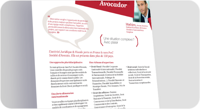 Juridique & Fiscal Avocador “Mon métier m'offre l'opportunité de participer Mathieu, Avocat, Directeur à des projets majeurs qui font l'actualité, au sein Diplômé d'un Master de Droit et d'une équipe multi-compétences. J’apprécie Fiscalité à l'université Paris particulièrement la dimension internationale des Dauphine projets, qui requiert une excellente maîtrise de l'anglais. ” Une situation complexe ? Avec plaisir L’activité Juridique & Fiscale porte en France le nom PwC Société d'Avocats. Elle est présente dans plus de 150 pays. Une approche pluridisciplinaire Une richesse d’expertises En tant qu'Avocat chez PwC Société d’Avocats, • Droit fiscal : Fiscalité Corporate • Droit social : Droit du Travail vous conseillez de grands groupes cotés (nationale & internationale), Fiscalité (relations individuelles et français et étrangers ainsi que des sociétés de Transactionnelle, Fiscalité Personnelle collectives), Droit de la sécurité tailles et de secteurs économiques variés, & Patrimoniale (Gestion de la Mobilité sociale, Droit de l’Immigration, dans le privé comme dans le public. Les Internationale, Politique de Droit de la Protection sociale, domaines d’expertises sont également variés Rémunérations...), Fiscalité Bancaire et Restructuration et dans la mesure où ils couvrent tous les Financière, Fiscalité Immobilière et Transactions exceptionnelles. domaines du Droit (fiscal, juridique et social). Stratégie Fiscale, TVA-Douanes, Prix de Transfert. Une forte dimension • Droit des affaires : Fusions- internationale Acquisitions, Droit des Sociétés, Droit Vous travaillez en équipes pluridisciplinaires Bancaire & Financier, Droit de la et êtes rapidement amené à développer vos Concurrence et de la Distribution, Droit qualités de coordination et de management. Commercial et des Contrats, Vous travaillez très souvent sur l'une des Gouvernance d’entreprise, Droit de la missions pour des clients français avec Propriété Industrielle et Intellectuelle, présence mondiale ou des clients étrangers IT et Cybersécurité. désireux de s’implanter en France. PwC | 19