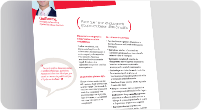 Consulting Coolsultant Guillaume, Parce que même les plus grands Manager au Consulting groupes ont besoin d’être conseillés Diplômé de Télécom SudParis Un encadrement propice Une richesse d’expertises à l’enrichissement des • Fonction finance : optimiser et transformer la compétences Fonction Finance et améliorer la performance de Pendant vos missions, vous l’entreprise. bénéficiez de l'expérience de • Opérations : faire face à l’incertitude par collaborateurs plus expérimentés et l’Excellence Opérationnelle sur l’ensemble de la mettez en pratique des approches chaîne de valeur de l’entreprise. PwC éprouvées. Vous vous • Ressources humaines & conduite du nourrissez d'environnements de travail, de cultures et de changement : faire de la gestion des ressources réglementations propices à enrichir humaines un facteur de compétitivité et “Ce que je préfère dans mon métier, vos compétences. accompagner les projets de transformation. ce sont les challenges quotidiens. • Technologie : maximiser la contribution du SI à Aucune mission n'est identique, que l’atteinte des objectifs stratégiques, à ce soit en termes de problématique, Un quotidien plein de défis l’amélioration de l’efficacité opérationnelle et à la d'équipe ou de client ! ” protection des actifs de l’entreprise. Chaque mission constitue un réel • Fraudes et litiges : prévenir, détecter et gérer les défi : nouveau client, nouveau sujet, fraudes et les litiges. nouvelle équipe. Cela demande de combiner savoir-faire technique et • Risques : mettre en place les dispositifs et savoir-être commercial. Vous processus permettant la maîtrise des risques. pouvez manager une équipe dès • Portfolio and Programme Management : ème votre 4 année, et transmettre à sécuriser et améliorer la performance et le votre tour votre savoir et vos pilotage de gestion de portefeuille de projets compétences. et de gestion de programmes complexes. • Experience Center : réinventer des expériences sans couture, mettre en œuvre des façons de travailler innovantes, combiner design et business. 20 |