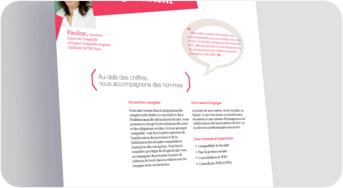 Expertise Comptable Expertinent “Mon métier suppose d’entretenir une relation quotidienne et de confiance avec mes Pauline, Directeur clients. Je bénéficie chaque jour du réseau de Expertise Comptable PwC. Mon portefeuille est international avec et Expert-Comptable stagiaire des clients qui sont des filiales de sociétés Diplômée de l’ISC Paris étrangères et des PME. ” Au-delà des chiffres, nous accompagnons des hommes Un métier complet Un travail d’équipe Nous intervenons dans la préparation des Le propre de notre métier est de travailler en comptes individuels ou consolidés et dans équipe, ce qui vous assure un encadrement l’établissement des déclarations fiscales. Nous formateur et une richesse d’échanges avec les prenons en charge l’externalisation des paies collaborateurs des autres métiers de PwC sur et des obligations sociales. En tant qu'expert les diverses problématiques rencontrées. comptable, vous êtes la pièce maîtresse de l’amélioration des processus et de la Une richesse d’expertises fiabilisation des données comptables et financières des entreprises. Vous êtes le • Comptabilité & fiscalité conseiller privilégié du dirigeant que vous • Paie & gestion sociale accompagnez dans la mise en place de tableaux de bord, dans la relation avec les • Consolidation & IFRS banques et les investisseurs. • Conseil aux PME et ETIs 22 |
