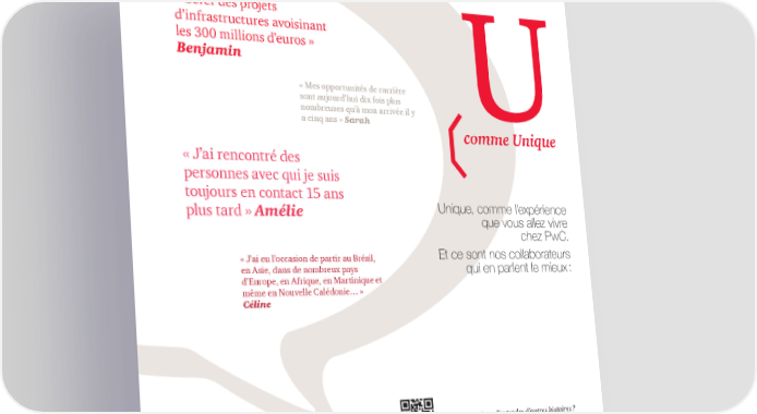 « Gérer des projets d’infrastructures avoisinant les 300 millions d’euros » Benjamin « Mes opportunités de carrière sont aujourd’hui dix fois plus nombreuses qu’à mon arrivée il y a cinq ans » Sarah comme Unique « J’ai rencontré des personnes avec qui je suis toujours en contact 15 ans plus tard » Amélie Unique, comme l’expérience que vous allez vivre chez PwC. « J’ai eu l’occasion de partir au Brésil, Et ce sont nos collaborateurs en Asie, dans de nombreux pays qui en parlent le mieux : d’Europe, en Afrique, en Martinique et même en Nouvelle Calédonie… » Céline Vous êtes curieux d’entendre d’autres histoires ? Rendez-vous sur www.pwc.fr/opportunidees PwC | 37