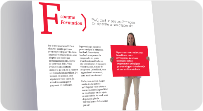 comme ème PwC, c’est un peu une 2 école. Formation On n’y arrête jamais d’apprendre ! Sur le terrain d’abord ! C’est L’apprentissage chez PwC chez vos clients que vous passe aussi par la culture du progresserez le plus vite. Vous feedback. Recevoir du Et parce que nous valorisons apprendrez chaque jour à vous feedback vous permet de l’excellence, nous adapter à de nouveaux comprendre les points développons au niveau environnements et à relever d’amélioration et les forces international des de nouveaux défis. Vous que vos collègues et managers programmes spécifiques évoluerez aux contacts voient en vous, et ainsi de pour développer le leadership d’experts au sein de la firme et progresser. Le feedback, vous de nos meilleurs talents. serez coaché au quotidien. De apprendrez à en recevoir, mission en mission, vous mais aussi à en donner ! aiguiserez votre vision du monde économique et Enfin, vous suivrez chaque gagnerez en confiance. année des formations spécifiques à votre métier et aurez également la possibilité de vous former sur les sujets de votre choix. Au total, nous dispensons plus de 200 000 heures de formation par an ! 6 |