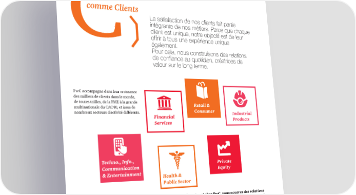 comme Clients La satisfaction de nos clients fait partie intégrante de nos métiers. Parce que chaque client est unique, notre objectif est de leur offrir à tous une expérience unique également. Pour cela, nous construisons des relations de confiance au quotidien, créatrices de valeur sur le long terme. PwC accompagne dans leur croissance des milliers de clients dans le monde, de toutes tailles, de la PME à la grande Retail & multinationale du CAC40, et issus de Consumer nombreux secteurs d’activité différents. Industrial Financial Products Services Techno., Info., Private Communication Equity & Entertainment Health & Public Sector En entrant chez PwC, vous nouerez des relations professionnelles privilégiées avec vos clients, qui vous serviront tout au long de votre carrière. 2 |