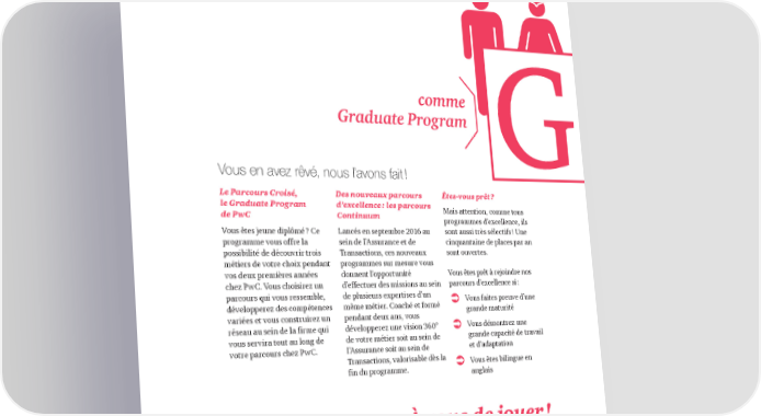 comme Graduate Program Vous en avez rêvé, nous l’avons fait ! Le Parcours Croisé, Des nouveaux parcours Êtes-vous prêt ? le Graduate Program d’excellence : les parcours Mais attention, comme tous de PwC Continuum programmes d’excellence, ils Vous êtes jeune diplômé ? Ce Lancés en septembre 2016 au sont aussi très sélectifs ! Une programme vous offre la sein de l’Assurance et de cinquantaine de places par an possibilité de découvrir trois Transactions, ces nouveaux sont ouvertes. métiers de votre choix pendant programmes sur mesure vous vos deux premières années donnent l’opportunité Vous êtes prêt à rejoindre nos chez PwC. Vous choisirez un d’effectuer des missions au sein parcours d’excellence si : parcours qui vous ressemble, de plusieurs expertises d’un Vous faites preuve d’une développerez des compétences même métier. Coaché et formé variées et vous construirez un pendant deux ans, vous grande maturité réseau au sein de la firme qui développerez une vision 360° Vous démontrez une vous servira tout au long de de votre métier soit au sein de grande capacité de travail votre parcours chez PwC. l’Assurance soit au sein de et d’adaptation Transactions, valorisable dès la Vous êtes bilingue en fin du programme. anglais À vous de jouer ! PwC | 7